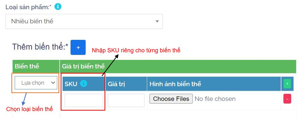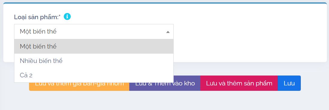 - Khi chọn loại biến thể, chương trình sẽ hiển thị những trường khác nhau để thêm vào với từng biến thể như: giá bán, giá nhập. Bạn có thể chọn thêm nhiều biến thể từ thanh xổ xuống.
