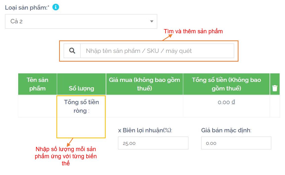- Khi chọn loại sản phẩm này: bạn sẽ cần nhập giá mặc định bao gồm/ không bao gồm thuế, % biên lợi nhuận ( bạn có thể thiết lập biên lợi nhuận mặc định từ "Cài đặt" -> "Cài đặt kinh doanh"; điều này sẽ giúp bạn nhập % biên lợi nhuận mọi lúc). Dựa trên tỷ suất lợi nhuận, nó sẽ tự động tính giá bán chưa bao gồm thuế. Tuy nhiên, bạn cũng có thể nhập giá bán thủ công và chương trình sẽ tự động điều chỉnh mức lợi nhuận cho bạn.