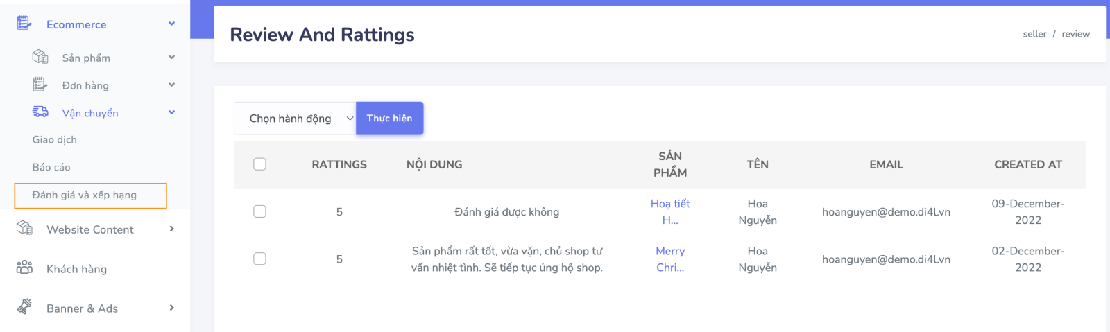 Để xem đánh giá và xếp hạng của các đơn hàng, ta sẽ vào mục "Đánh giá và xếp hạng" như hình bên dưới: