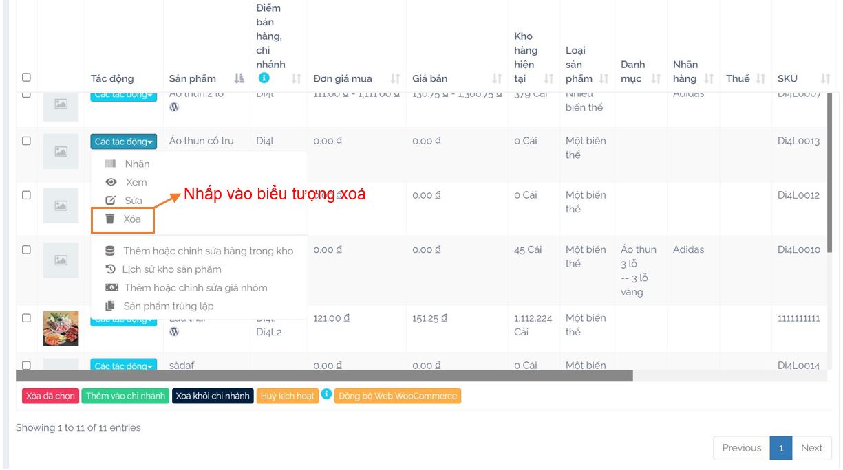 Để xoá từng sản phẩm , ta vào mục "Sản phẩm" -> "Danh sách sản phẩm", ta thực hiện như hình sau: